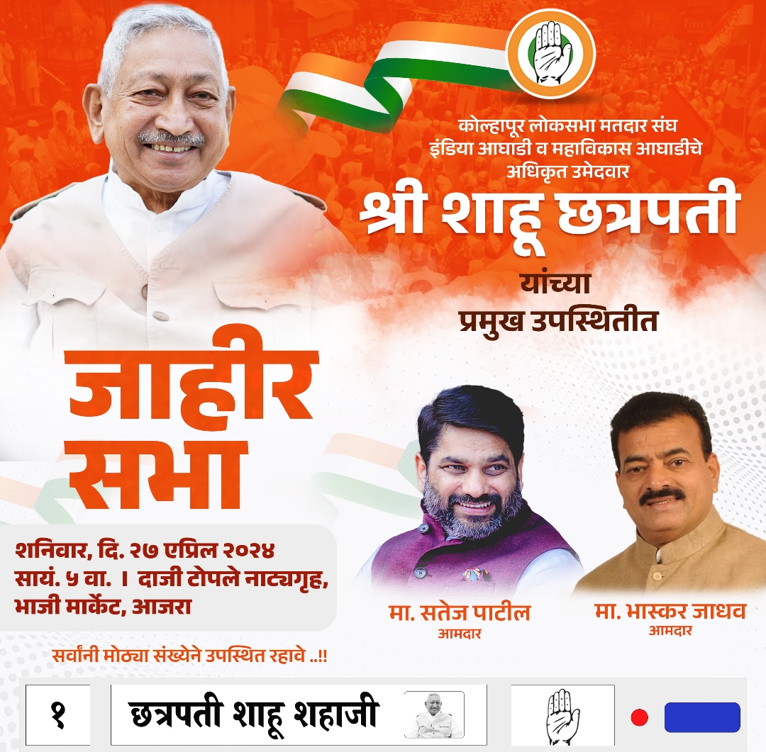 कोल्हापूर लोकसभा मतदारसंघातील इंडिया आघाडी व महाविकास आघाडीचे उमेदवार श्री शाहू छत्रपती यांच्या प्रचारार्थ आज शनिवार दिनांक २७ एप्रिल रोजी सायंकाळी पाच वाजता दाजी टोपले नाट्यगृह, भाजी मंडई येथे आमदार सतेज पाटील व आमदार भास्कर जाधव यांच्या जाहीर सभेचे आयोजन करण्यात आल्याचे संयोजकांच्या वतीने सांगण्यात आले आहे.