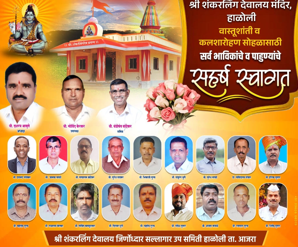 हाळोली येथील श्री शंकर लिंग देव मंदिर वास्तुशांती व कलशारोहण सोहळ्यास काल गुरुवार दिनांक २ मे पासून उत्साहात सुरुवात झाली असून आज शुक्रवारी उर्वरित धार्मिक कार्यक्रमांसह दुपारी १.३० ते सायंकाळी ५ वाजेपर्यंत महाप्रसादाचे आयोजन करण्यात आले आहे.