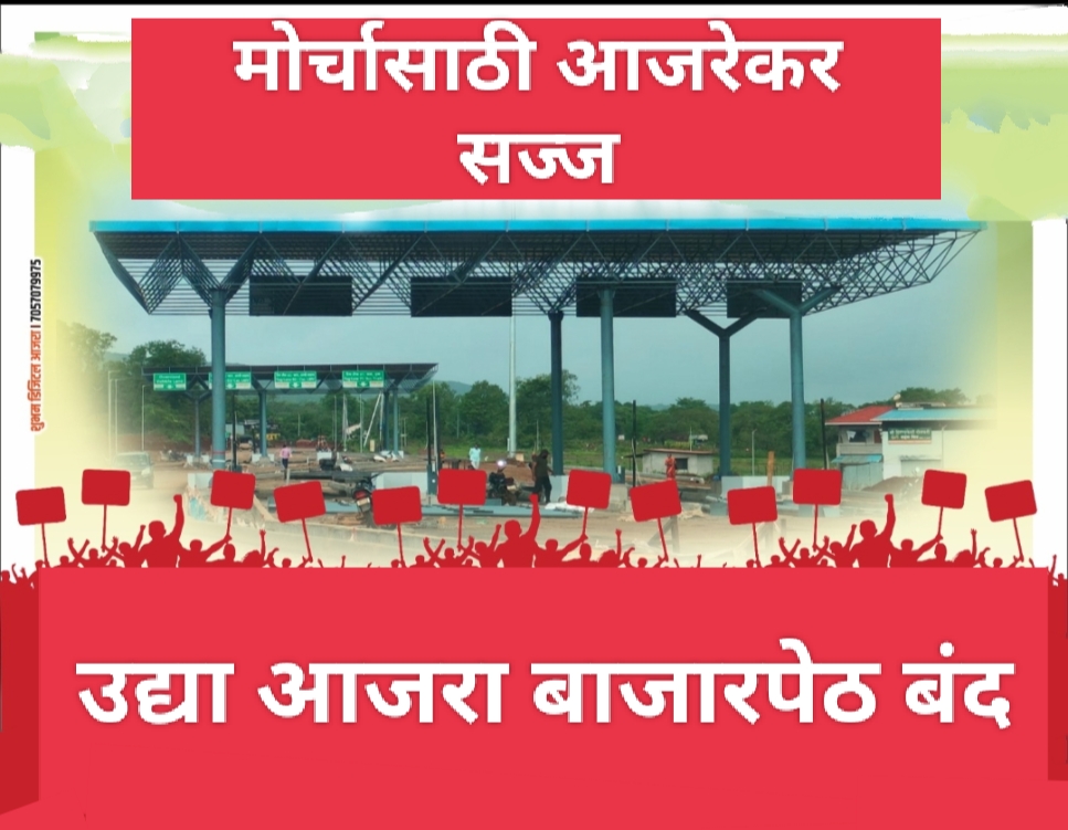 संकेश्वर – बांदा राष्ट्रीय महामार्गावरील आजऱ्याजवळील टोलला हद्दपार करण्यासाठी उद्या सोमवार, दि. २४ जून रोजी आजरा बंदचे आवाहन व्यापारी असोसिएशनने केले आहे. टोलमुक्ती संघर्ष समितीच्या वतीने मोर्चा काढला जाणार आहे. मोर्चाच्या तयारीच्या पार्श्वभूमीवर रवळनाथ मंदिरात झालेल्या बैठकीत हा निर्णय घेण्यात आला.