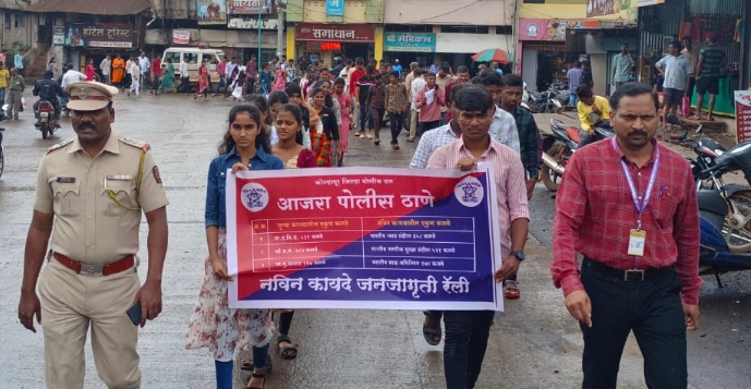 आजरा पोलीस ठाण्याच्या वतीने नवीन साई पोलीस निरीक्षक नागेश यमगर यांच्या नेतृत्वाखाली नवीन कायदे जनजागृती रॅली काढण्यात आली. यावेळी रॅलीमध्ये विद्यार्थी मोठ्या संख्येने सहभागी झाले होते.