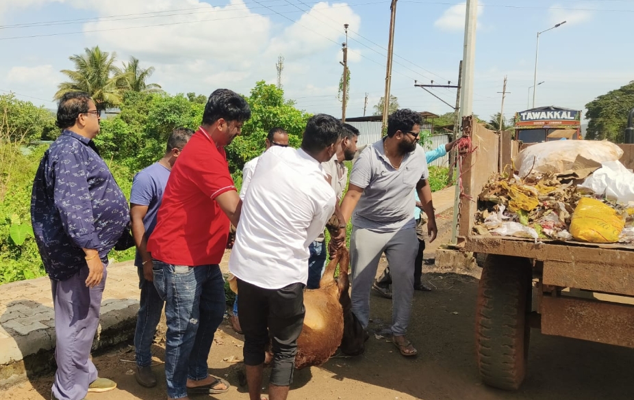 रविवारी सकाळी कचऱ्यातच खाद्य शोधणाऱ्या वासराला चारचाकी वाहनाने धडक दिल्याने वासराचा जागीच मृत्यू झाला.अन्याय निवारण समितीच्या कार्यकर्त्यांनी सदर मृत वासराला उचलून नगरपंचायत कर्मचाऱ्यांच्या मदतीने इतरत्र हलवले.