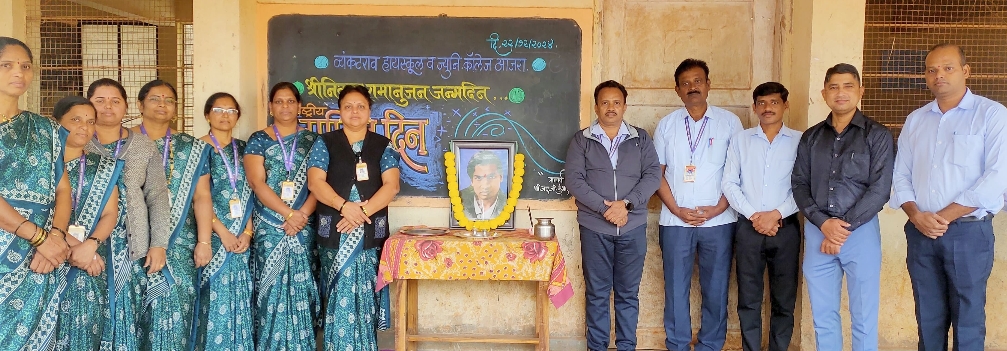 भारतीय गणितज्ञ श्रीनिवास रामानुजन यांच्या जन्मदिनाचे औचित्य साधून “राष्ट्रीय गणित दिन” व्यंकटराव हायस्कूल व जुनिअर कॉलेज आजरा या प्रशालेत प्राचार्य आर. जी. कुंभार व पर्यवेक्षिका सौ. व्ही.जे.शेलार यांचे हस्ते प्रतिमा पूजनाने संपन्न झाले.