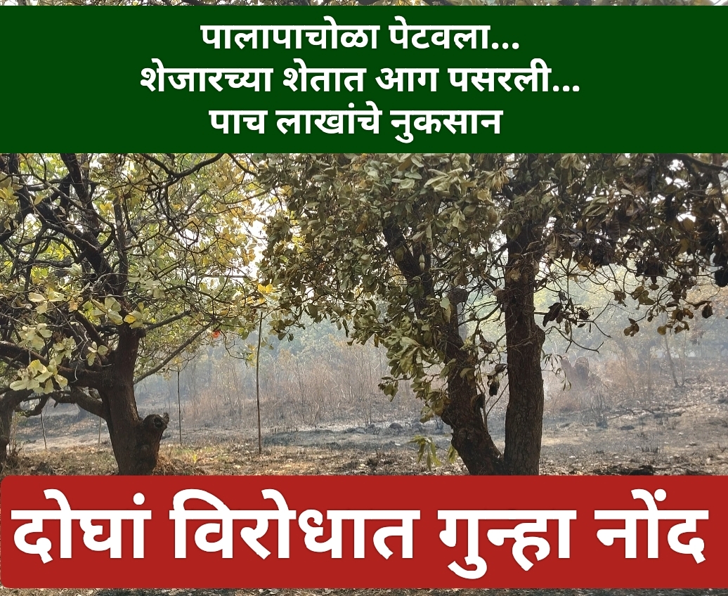स्वतःच्या शेतामध्ये पालापाचोळा पेटवण्याच्या उद्देशाने भर दुपारी लावलेल्या आगीवर नियंत्रण ठेवता न आल्याने आजूबाजूच्या शेतामध्ये आग पसरून विठ्ठल महादेव जाधव यांच्या शेतातील काजू, आंबा, चिक्कू,मेसकाठी इत्यादीचे सुमारे पाच लाखांचे नुकसान केल्याप्रकरणी साळगाव येथील बंडू गोविंद जाधव व रोहन सागर जाधव यांच्या विरोधात पोलीसांत गुन्हा नोंद करण्यात आला आहे.