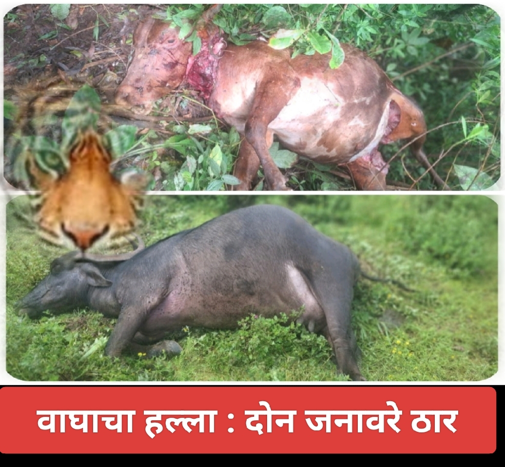 कस्तुरे यांनी नेहमी प्रमाणे जनावरे चरावयास सोडली होती. दरम्यान झाडीत दबा धरून बसलेल्या वाघाने जनावरांच्या कळपावर हल्ला केला. त्यांच्या हल्यात बैल व म्हैस ठार झाली आहे.