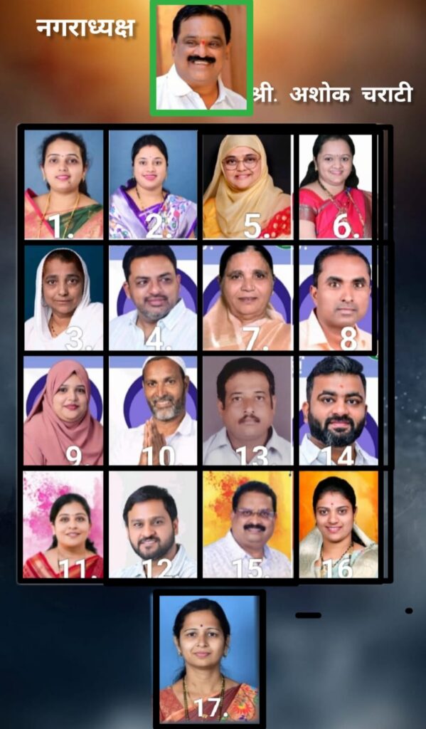 नगराध्यक्ष पदाचे उमेदवार अशोक अण्णा चराटी व त्यांचे चिरंजीव अनिकेत नगरसेवक पदाकरिता निवडून आले आहेत तर