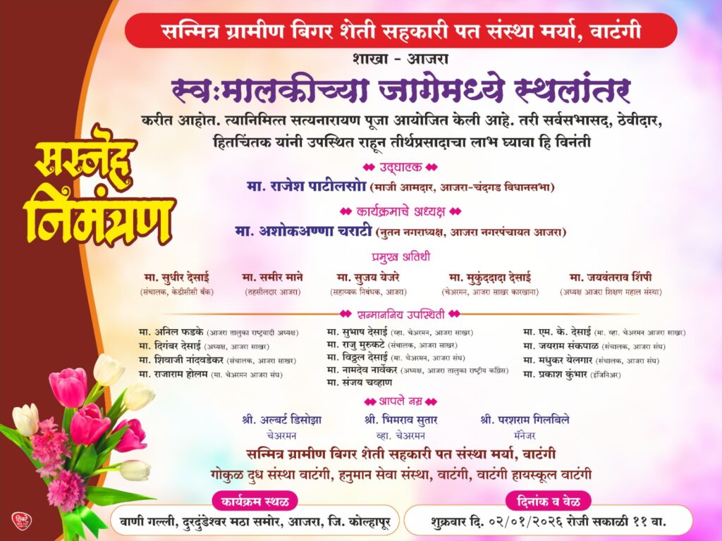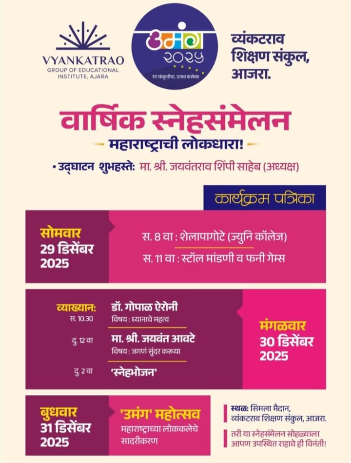 जनता एज्युकेशन सोसायटी संचलित आजरा महाविद्यालयाचे २०२५-२६ चे वार्षिक स्नेहसंमेलन व पारितोषिक वितरण समारंभ शुक्रवार दिनांक २ जानेवारी २०२६ रोजी सकाळी साडेदहा वाजता आयोजित करण्यात आला आहे. प्रसिद्ध हास्य कवी प्रा. डॉ .विष्णु सुरासे हे प्रमुख पाहुणे म्हणून सदर कार्यक्रमास उपस्थित राहणार आहेत .जनता शिक्षण संस्थेचे अध्यक्ष अशोकण्णा चराटी यांच्या अध्यक्षतेखाली होणाऱ्या या कार्यक्रमास संस्थेचे संचालक मंडळ, सल्लागार मंडळ शिक्षक वर्ग विद्यार्थी यांच्यासह मान्यवर उपस्थित राहणार असल्याचे स्नेहसंमेलन प्रमुख डॉ. बी. एम. मोहिते यांनी सांगितले.