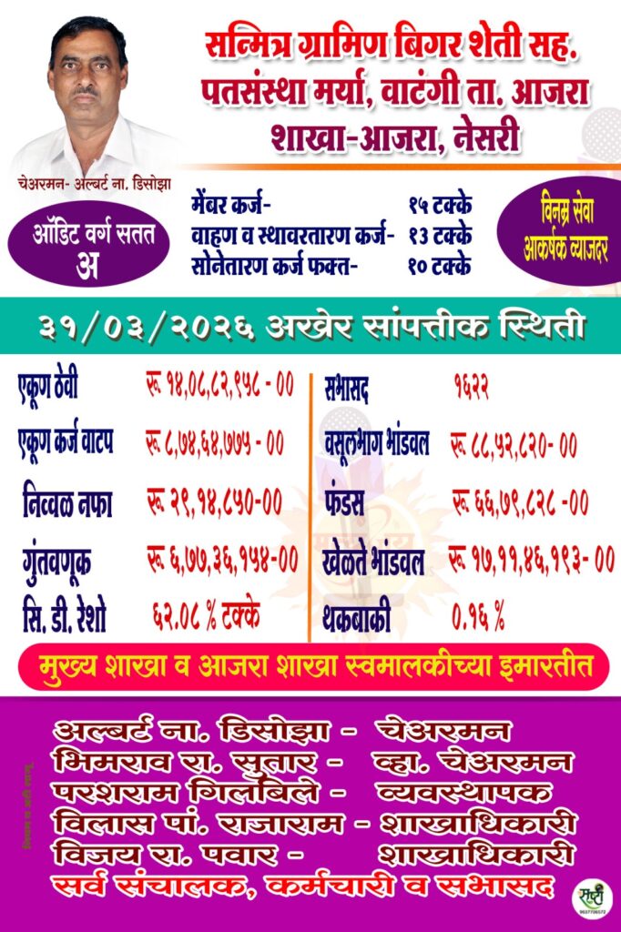 वसंतराव देसाई आजरा शेतकरी सहकारी साखर कारखान्याचे संचालक मंडळाने नुकताच निर्णय घेवून कारखान्याकडे रु.१५०००/- शेअर्स रक्कम पुर्ण असणा-या अ व ब वर्ग सभासदांना प्रत्येकी ५० किलो साखर, शेअर्स पोटी रु.१००००/- जमा असलेल्या सभासदांना प्रत्येकी २५ किलो तर शेअर्स रक्कम रु.७०००/- जमा असणा-या सभासदांना प्रत्येकी १५ किलो साखर त्याचप्रमाणे कारखान्याच्या सन २०२५-२६ गळीत हंगामात गळीतासाठी ऊस पुरवठा केलेल्या ऊस पुरवठादारांना प्रतिटन अर्धा किलो साखर प्रति किलो रु.२५/- प्रमाणे सवलतीच्या दरात दि.१६/४/२६ ते दि.१५/५/२६ या कालावधीत वाटप केली जाणार आहे.